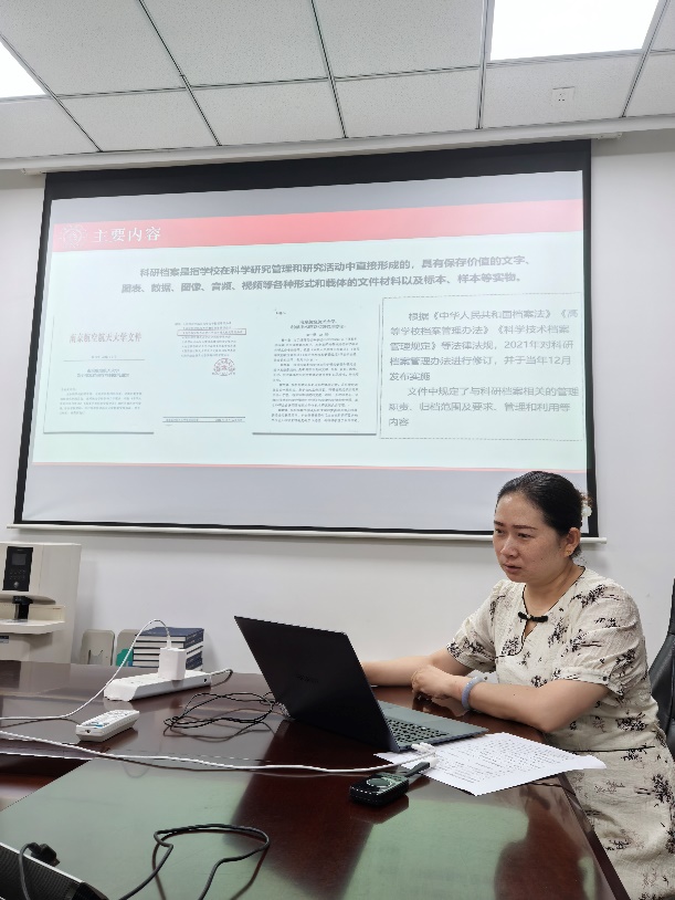 接着档案馆潘婷婷、赵浩男两位老师分别就科研档案和设备档案管理的基本工作流程、档案收集范围、整理规范要求、利用流程和相关注意事项进行了专项培训。
