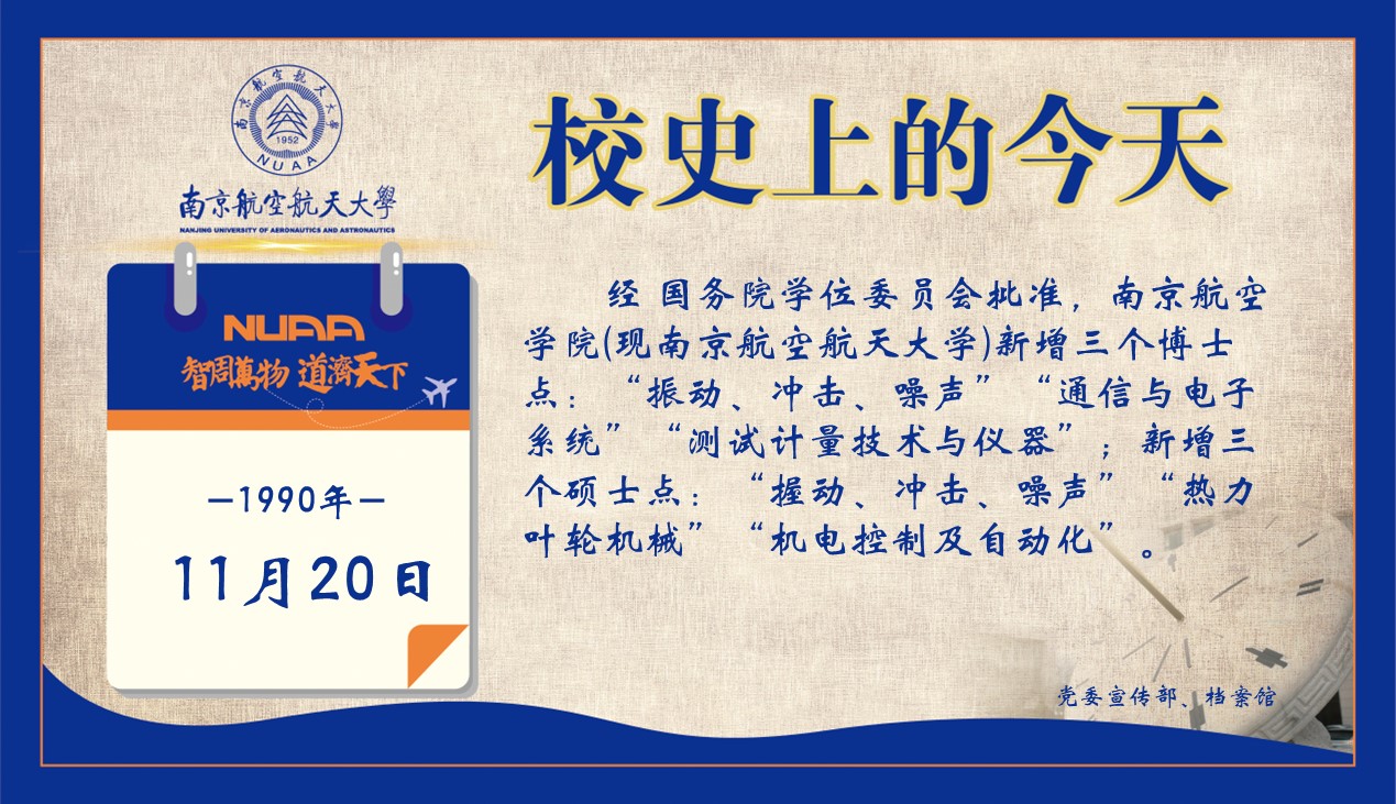 经国务院学位委员会批准,南京航空学院(现南京航空航天大学)新增三个博士点:“振动、冲击、噪声”“通信与电子系统”“测试计量技术与仪器”;新增三个硕士点:“握动、冲击、噪声”“热力叶轮机械”“机电控制及自动化”。