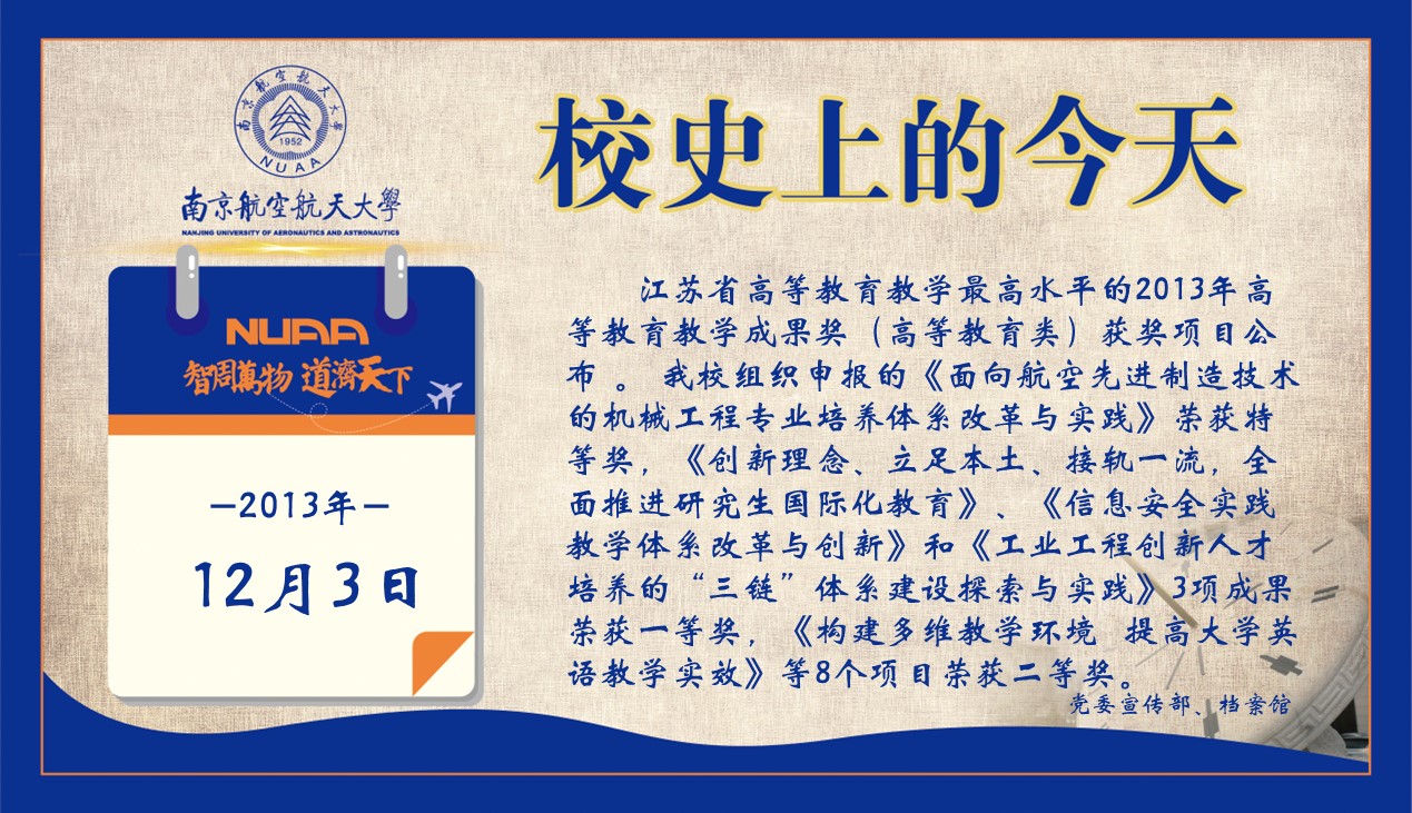 江苏省高等教育教学最高水平的2013年高等教育教学成果奖(高等教育类)获奖项目公布。我校组织申报的《面向航空先进制造技术的机械工程专业培养体系改革与实践》荣获特等奖,《创新理念、立足本土、接轨一流,全面推进研究生国际化教育》、《信息安全实践教学体系改革与创新》和《工业工程创新人才培养的“三链”体系建设探索与实践》3项成果荣获一等奖,《构建多维教学环境 提高大学英语教学实效》等8个项目荣获二等奖。