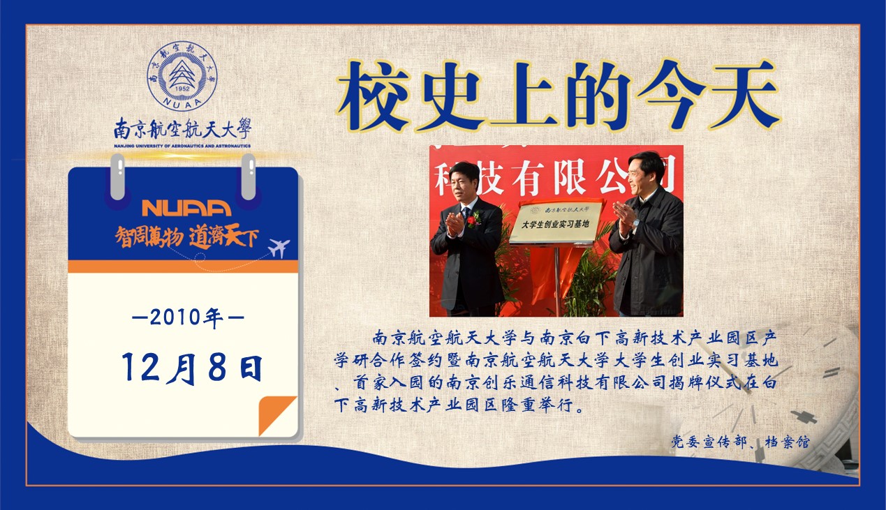 南京航空航天大学与南京白下高新技术产业园区产学研合作签约暨南京航空航天大学大学生创业实习基地、首家入园的南京创乐通信科技有限公司揭牌仪式在白下高新技术产业园区隆重举行。
