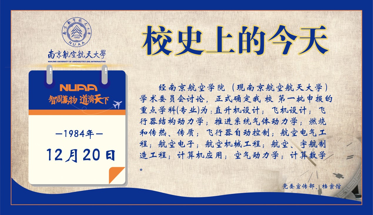 经南京航空学院(现南京航空航天大学)学术委员会讨论,正式确定我校第一批申报的重点学科(专业)为:直升机设计;飞机设计;飞行器结构动力学;推进系统气体动力学;燃烧和传热、传质;飞行器自动控制;航空电气工程;航空电子;航空机械工程;航空、宇航制造工程;计算机应用;空气动力学;计算数学。